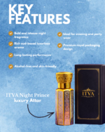 ITVA Night Prince Attar is a powerful and sophisticated fragrance crafted for the modern man who commands attention. Inspired by the mystery of the night, this attar blends deep oud notes with a smooth and intense aroma, creating a bold and unforgettable scent experience.